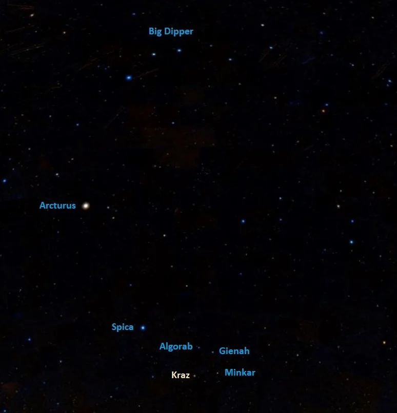 Kraz is easy to find because it lies in the proximity of Spica, one of the brightest stars in the sky, and because it is part of a recognizable asterism, Spica’s Spanker. While the Spanker asterism can be used to identify Spica, its stars are considerably fainter than Virgo’s luminary and it is easier to use Spica to find them instead. Spica lies on an imaginary curved line extended from the stars of the Big Dipper’s handle—Alioth, Mizar and Alkaid – southward. Arcturus, the fourth brightest star in the sky, is the first bright star along the line and Spica is the second.