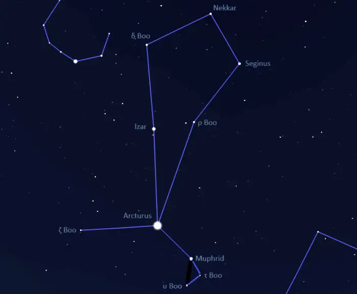 Arcturus and Muphrid are part of the Kite, a relatively bright asterism that dominates the constellation Boötes. The Kite is a familiar feature of the northern spring sky. Sometimes called the Ice Cream Cone, the star pattern is formed by the brightest stars of Boötes. The main Kite pattern is formed by Arcturus, Izar, Delta Boötis, Nekkar, Seginus, and Rho Boötis, while Muphrid, Zeta, Tau and Upsilon Boötis form the tether and tail. The asterism can be spotted from areas without too much light pollution.
