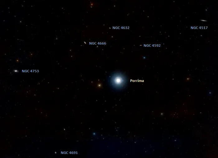 Porrima is one of the six bright stars that form the Y of Virgo. The asterism is also formed by Spica (Alpha Virginis), Minelauva (Delta Virginis), Vindemiatrix (Epsilon Virginis), Zaniah (Eta Virginis), and Zavijava (Beta Virginis). It can be used to find the Virgo Cluster of galaxies. Spica, the brightest star in Virgo, appears at the base of the Y and Porrima is the middle star of the bowl. Minelauva and Vindemiatrix appear to the left of Porrima, and Zaniah and Zavijava to the right. The Virgo Cluster appears within the bowl of the Y. Its centre lies roughly halfway between Vindemiatrix and Denebola at the Lion’s tail.